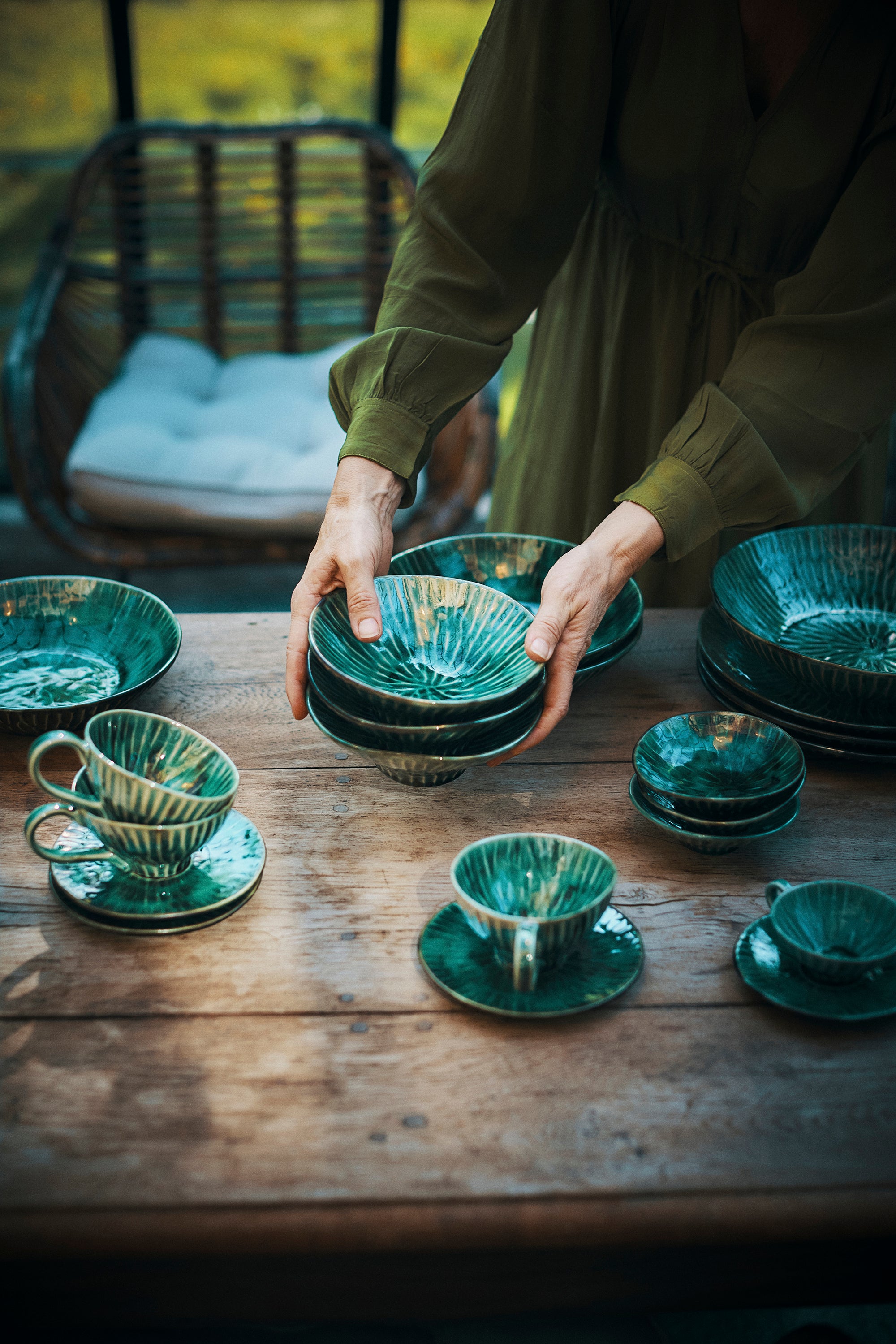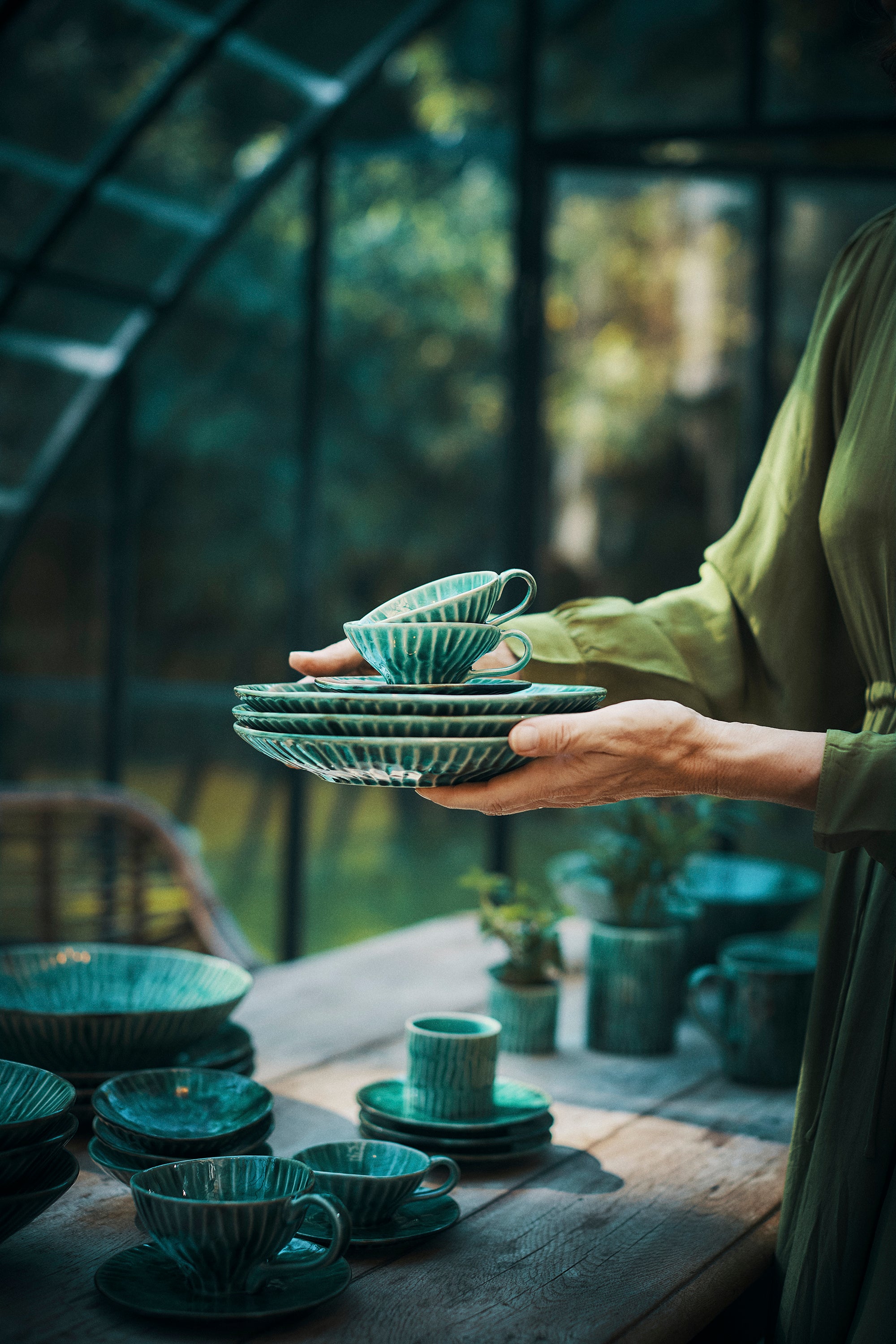 The Verde Lanza tableware collection by Pascale Naessens refers to the island of Lanzarote, where she often resides. Pascale drew inspiration from the green-painted wooden windows, doors, and sparse vegetation that contrast so strikingly with the black volcanic landscape. The sun-worn green, a color that pairs beautifully with delicious foods, is enhanced by the shell-like texture she imprinted with her own fingers. A collection that radiates Pascale’s signature style and the warmth of the sun.